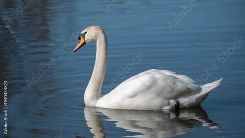 White swan in serene profile with soft natural lighting on calm blue water for wildlife photography