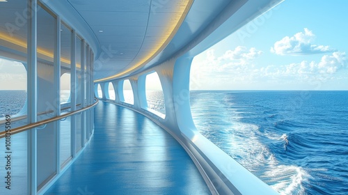 Wide Curved Corridor of a Cruise Ship with Stunning Views of Seaside Scenery
