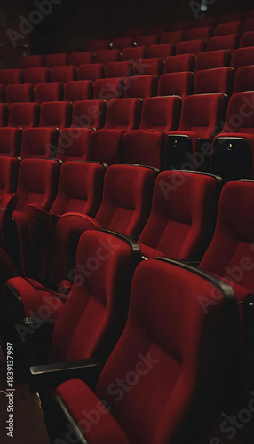 wide-angle shot of an empty movie theater with red seats, soft dim lighting, calm cinematic mood, no people.Empty Movie Theater Seats. Cinematic Empty Auditorium. Silent Cinema Hall.