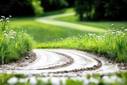 Winding dirt path through a vibrant green meadow. A picturesque country lane meanders through lush, grassy fields filled with wildflowers