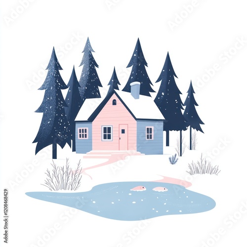 Winter Cottage Scene with Frozen Pond and Trees