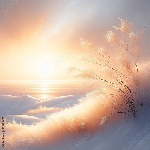Winter landscape with reeds and sunset. Nature background. Print art.