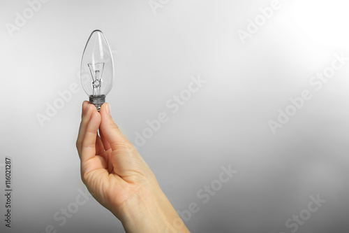 Woman hand holding bulb on grey background