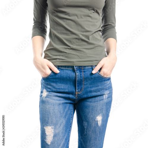 Woman in blue jeans and green shirt hand in pocket macro on white background isolation
