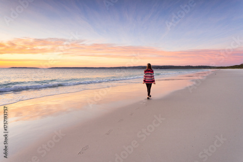 Woman morning walk along the beach sunrise sky