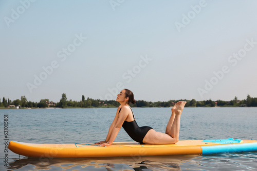Woman practicing yoga on SUP board on river