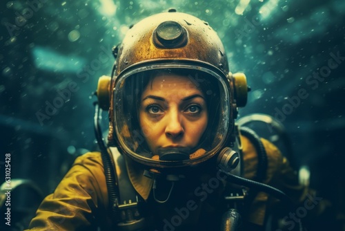 Woman scuba diving in the deep ocean, exploring an underwater shipwreck and revealing the sense of adventure and exploration. Generative AI