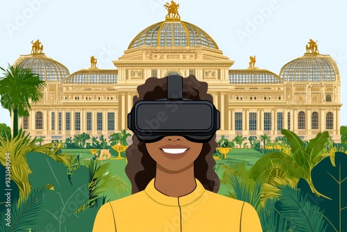 Woman standing in front of a grand architectural landmark wearing a VR headset merging the historical grandeur with the modern possibilities of virtual reality in a unique digital experience