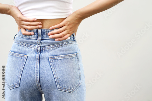 Woman suffering from waist, backache or hip pain. lower back while , chronic back pain, in office syndrome, scoliosis, herniated disc, muscle inflammation.