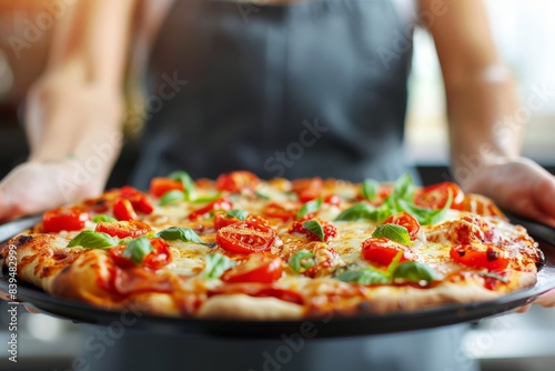 Woman taking out a mouth watering pizza from the oven, ready for a delightful meal