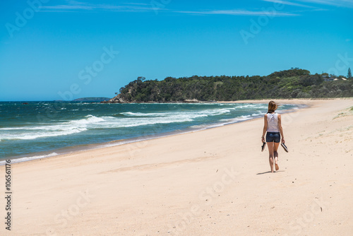 Woman walking along a completely deserted beach strip on the eastern coast of Australia.