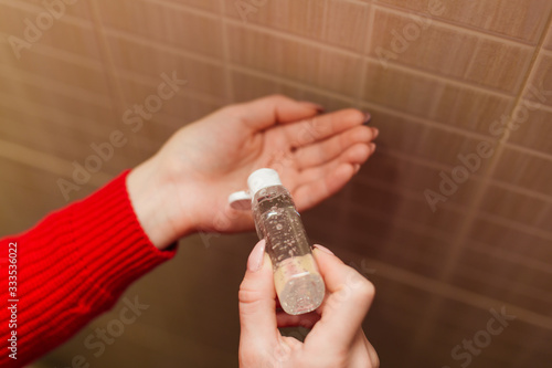 women wash their hands with alcohol gel or an antibacterial soap disinfectant