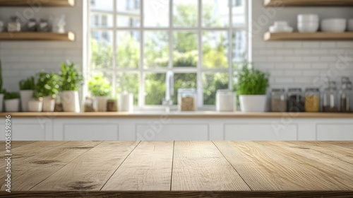 Wood counter top in a cozy kitchen scene with white cabinets and bokeh blur. Clean background for displaying kitchenware or food items with a modern touch.