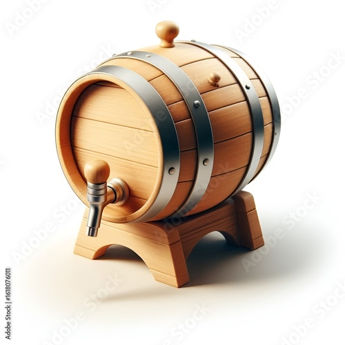 Wooden beer barrel with tap, clean white background, shadow beneath.