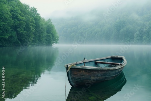 Wooden rowboat rests on a misty lake surrounded by a green forest in the early morning