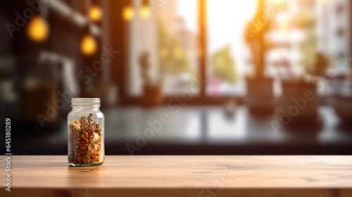 Wooden table on blurred kitchen bench background, Empty beautiful wood table top counter and blur bokeh modern kitchen interior background in clean and bright