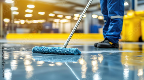 Worker Cleaning Shiny Industrial Floor with Mop in a Well-Lit Warehouse