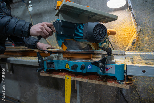 Worker cutting PVC window frame profile with electric miter saw in workshop, plastic window manufacturing process.