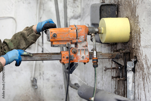 Worker using an electric drill to make a hole in a concrete wall, closeup