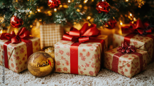 wrapped presents underneath a Christmas tree