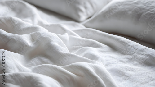 Wrinkled Soft Linen Sheets: A close-up showcases the inviting texture of freshly laundered, pure linen sheets, their soft folds creating a soothing and comfortable atmosphere.