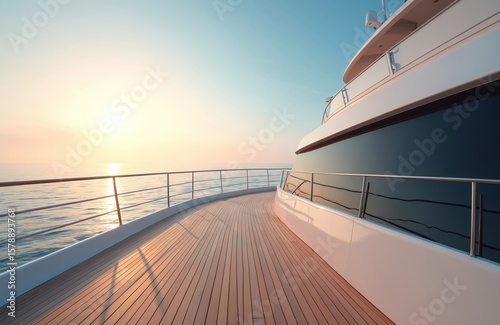 Yacht deck at sunset. Luxury ship on sea. Sun, blue sky, calm water. Journey, vacation, travel, holidays. Relax, enjoy cruise, travel, rich lifestyle. Modern vessel for maritime adventure. Maritime