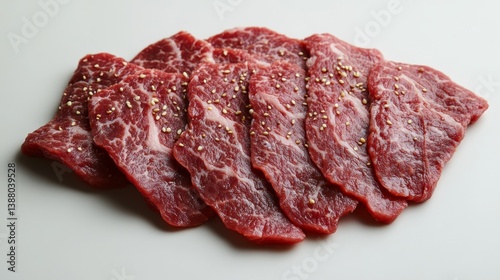 Yakiniku is the food that grilled a thin sliced beef and dipped in a soy-bean sauce based sauce. Yakiniku gas grill for grill food in company of friends. Wooden table with beef slices, Korean Panchkha