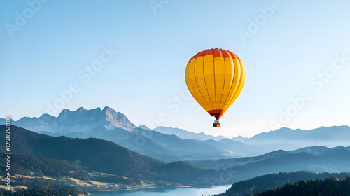 Yellow Hot Air Balloon Floating Above Mountainous Landscape Under Clear Blue Sky