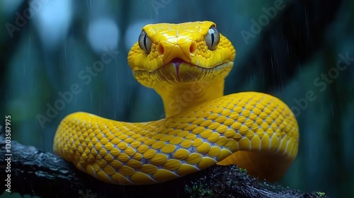 Yellow viper in rainforest during a rain shower