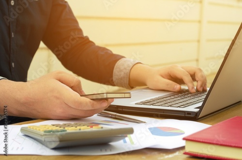 young accountant or business man using smartphone with calculator, data sheet, laptop on desk, analyzing and calculate, savings, finances, economy concept, sunlight effect, soft focus, selective focus