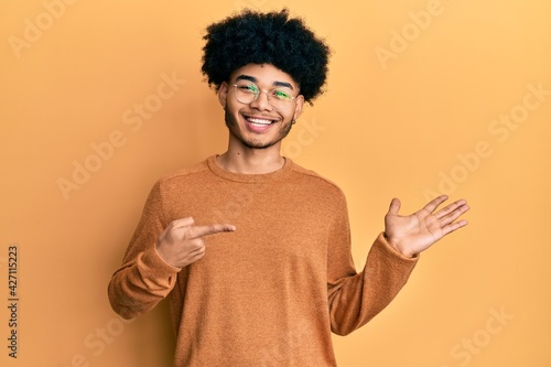 Young african american man with afro hair wearing casual winter sweater amazed and smiling to the camera while presenting with hand and pointing with finger.