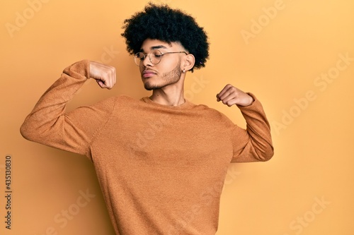 Young african american man with afro hair wearing casual winter sweater showing arms muscles smiling proud. fitness concept.