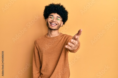 Young african american man with afro hair wearing casual winter sweater smiling friendly offering handshake as greeting and welcoming. successful business.
