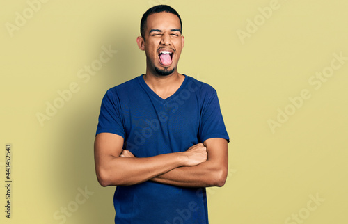 Young african american man with arms crossed gesture sticking tongue out happy with funny expression.