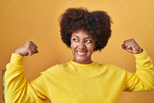 Young african american woman standing over yellow background showing arms muscles smiling proud. fitness concept.