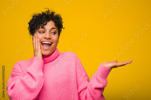 Young african american woman wearing a pink sweater holds copy space on a palm, keep hand over cheek. Amazed and delighted.