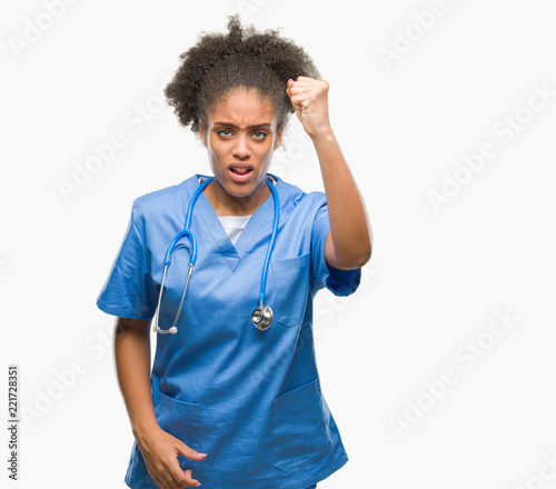 Young afro american doctor woman over isolated background angry and mad raising fist frustrated and furious while shouting with anger. Rage and aggressive concept.