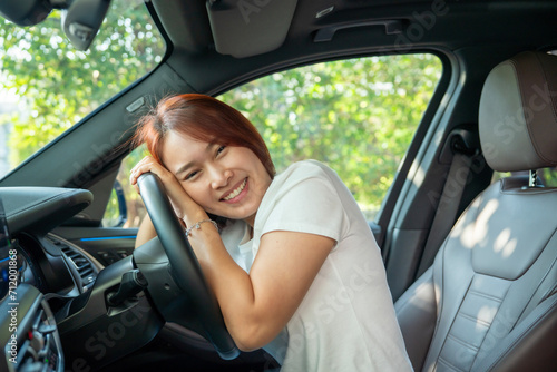 Young and cheerful woman enjoying new car hugging steering wheel sitting inside