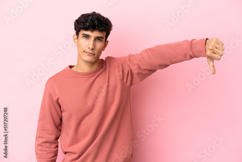 Young Argentinian man isolated on pink background showing thumb down with negative expression