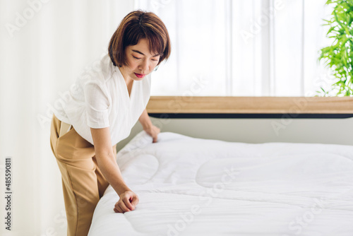 Young asian woman housewife clean bed and set up changing bedsheet with white clean sheet tidy up bedroom.room service and cleaning concept