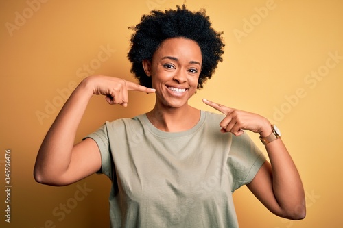 Young beautiful African American afro woman with curly hair wearing casual t-shirt smiling cheerful showing and pointing with fingers teeth and mouth. Dental health concept.