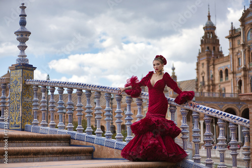 Young, beautiful, blonde woman in red flamenco dress, flowers in her hair and gold jewelry, performing flamenco poses on a nice bridge in the square of Spain in Seville. Dance concept, art, typical.