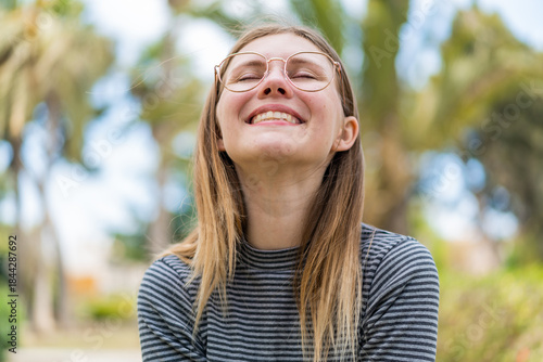 Young blonde woman with glasses at outdoors . Portrait