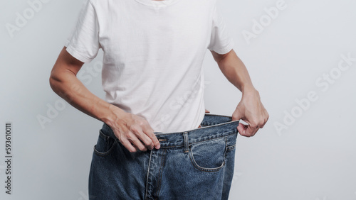 man, jean, weight, loss, diet, health, male, body, fitness, lifestyle, slim, person, waist, fit, belly, pant, stomach, isolated, young, white, adult, exercise, figure, shape, success, asian, asia, chinese, china, japanese, torso, size, abdomen, thin, skinny, happy, measure, trousers, standing, attractive, obesity, loose, after, care, waistline, physical exercise, meter, arm, challenge