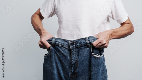 Young confident asian chinese weight loss man with oversize of jean pants.