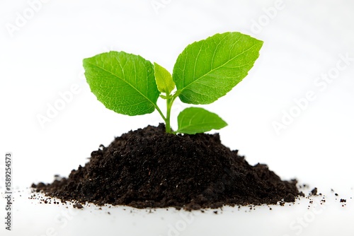 Young green plant growing from rich dark soil