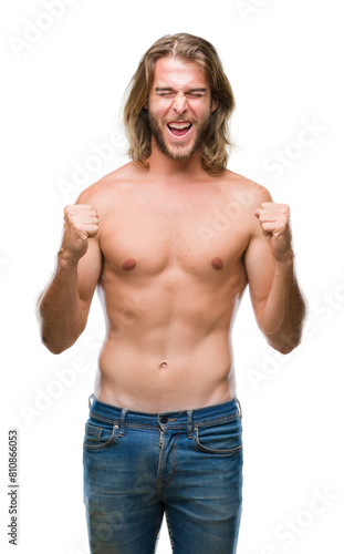 Young handsome shirtless man with long hair showing sexy body over isolated background excited for success with arms raised celebrating victory smiling. Winner concept.