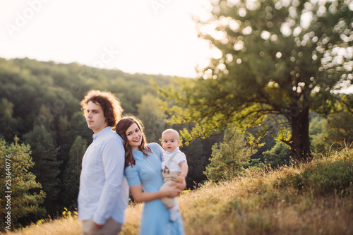 Young happy caucasian couple with little baby boy. Parents and son walking and having fun together. Mother and father playing with toddler outdoors. Family, parenthood, childhood, happiness concept.