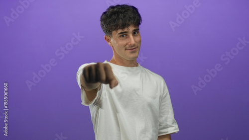 Young hispanic man points fist to camera in purple studio wearing white tshirt with relaxed smile and extended arm; confidence.