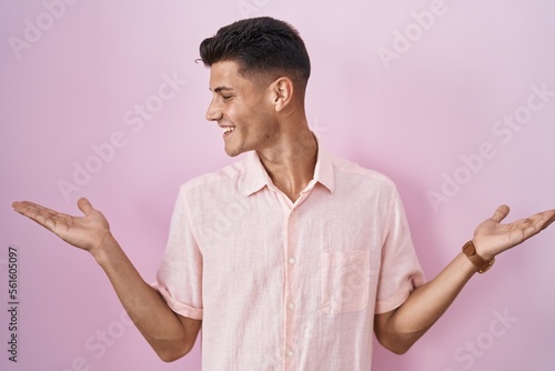 Young hispanic man standing over pink background smiling showing both hands open palms, presenting and advertising comparison and balance